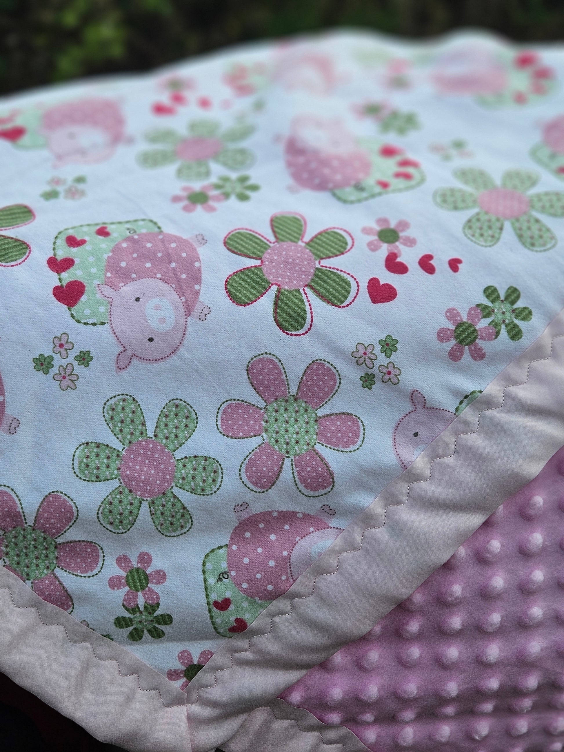 The Piggy Fleece Baby Blanket features an adorable piggy and flower design that adds charm to your baby's space. Its soft minky side in pretty pink offers a snuggly, plush feel perfect for cuddles and comfort. Lightweight yet cozy, this blanket makes every nap and playtime extra delightful.