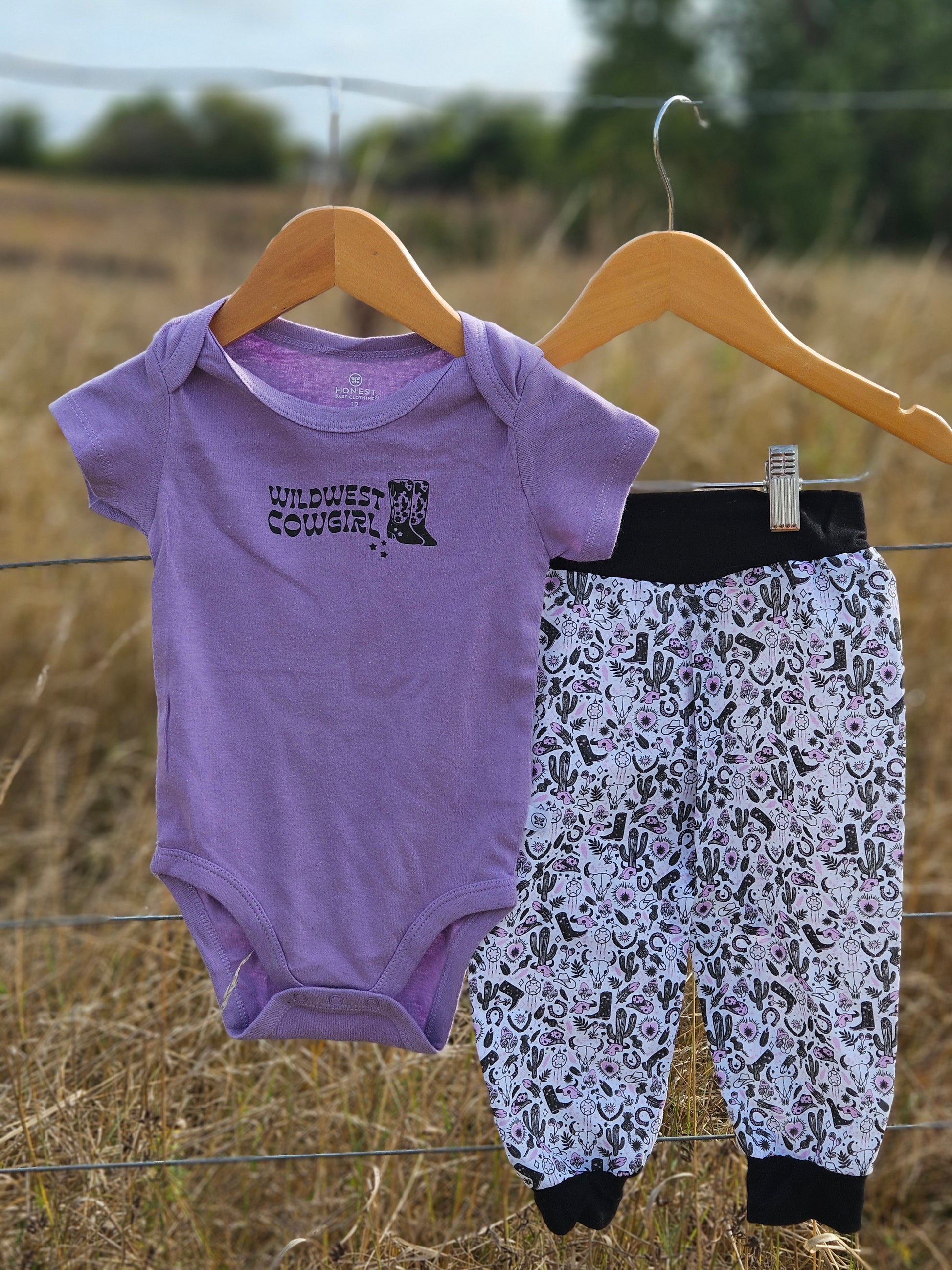 Bring a dash of purple charm to playtime with this Wild West Cowgirl Jogger Set. Featuring a playful design inspired by the spirit of the frontier, it combines cozy comfort with a touch of adventurous style. Perfect for little cowgirls ready to roam, this outfit makes every day feel like a fun-filled ride in the wild west.